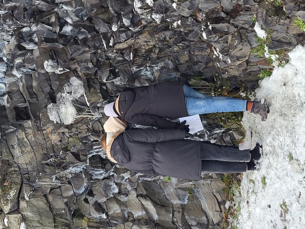 Wie auf den Bildern zu erkennen, interessierten sich die Schülerinnen und Schüler vor allem für die Eiszapfen an den Basaltsäulen und den Schnee auf dem Hügel des Parksteins (Kapelle).