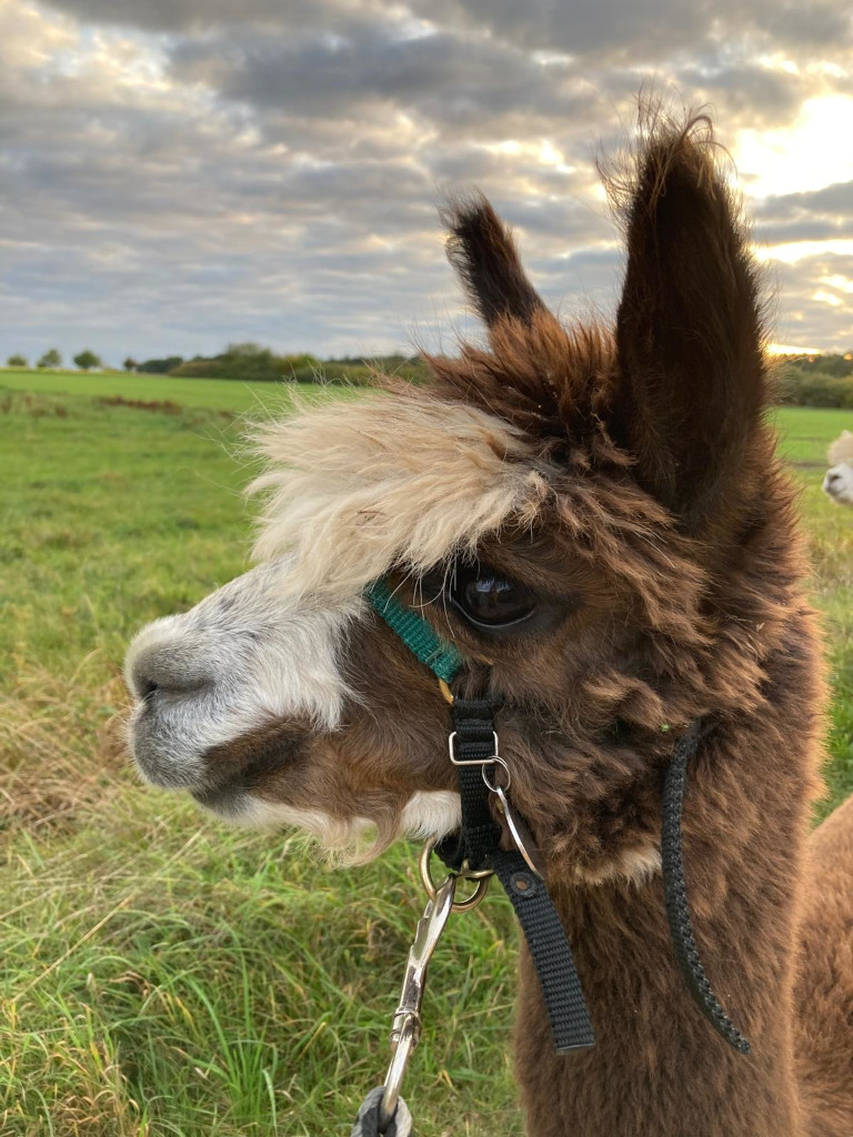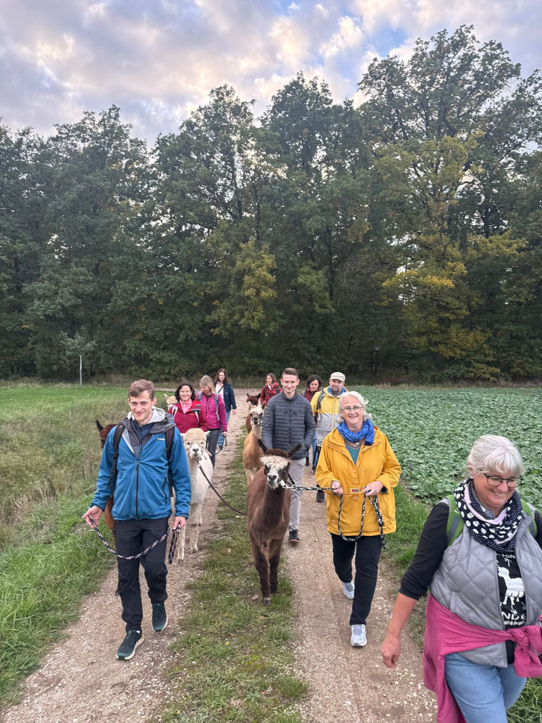 Die Kolleginnen und Kollegen der fortbildungsfreudigen Fachschaften Biologie und Chemie haben sich an einem herbstlichen Donnerstagnachmittag zu einer Alpakawanderung aufgemacht. Unter dem Titel „Alpakawanderung: Verhaltensbeobachtung beim Tier und gleichzeitig Stressreduktion durch Entschleunigung im Berufsalltag“ liefen die Teilnehmenden unter der Führung von Anke Siegismund von den Bimbachtal Alpakas auf Forst- und Feldwegen Richtung Obermembach. Acht völlig wesensunterschiedliche Tiere wurden von den Lehrerinnen und Lehrern geführt, zunächst noch etwas unsicher, dann aber immer souveräner. Frau Siegismund erklärte einiges zu den einzelnen Tieren, ihren Wesenseigenschaften, ihrer Herkunft und der Rasse, aber auch zu besonderen Verhaltensweisen und dem Einsatz zwei ihrer Tiere im Seniorenheim. Erwiesenermaßen reduziert der Kontakt zu Tieren das Stressempfinden durch die verminderte Ausschüttung des Stresshormons Cortisol und zeitgleich die erhöhte Ausschüttung des „Wohlfühlhormons“ Oxytocin. Diesen Effekt konnten (noch) nicht alle Teilnehmenden gleichermaßen spüren. Freunde an dem Ausflug hatten jedoch alle.