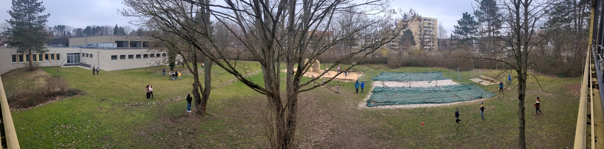 Frisch gestaltet und gut ausgestattet ist auch unser Pausenhof, der auf zwei Seiten vom Schulgebäude und auf den anderen von Mensa, Steinforstgraben und den "Orgelpfeifen" eingeschlossen wird und damit einen perfekten Schutzraum zur Pausenerholung bietet.