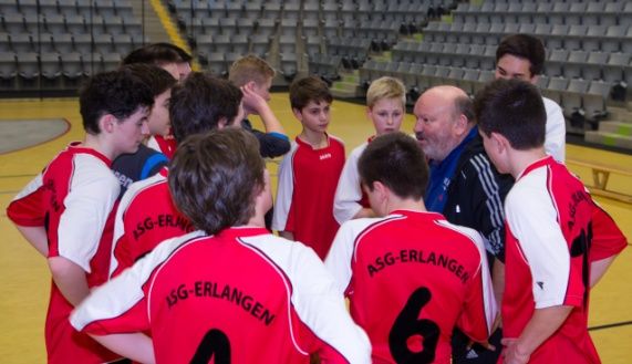 Die sportliche Entwicklung des Handballstützpunkts am ASG hat sich im Schuljahr 2014/15 überaus positiv fortgesetzt. Seit diesem Schuljahr beginnt das Handballtraining bereits in den 5. Klassen mit dem differenzierten Sport der 3. Sportstunde. Erweitert und fortgeführt wird das Training seitens der Schule durch zwei Trainingsstunden für Schulmannschaften, die genutzt werden, um von Bundesliga-Trainer Frank Bergemann spezielle Fähigkeiten zu erlernen. Dazu kommen drei Trainingsstunden in der Mittagspause, die offen sind für alle SchülerInnen, und von unserem Partnerverein HC Erlangen angeboten werden. Sehr namhafte und hoch spezialisierte Übungsleiter, darunter Jan Stochl (Bundesliga-Torhüter), Sebastian Preiß (Handballweltmeister 2007) oder Ulli Wichmann (Torwarttrainer des HCE), geben ihr Können in spielerischer Form an die SchülerInnen weiter. Mit Begeisterung wird dieses Angebot von immer mehr Mädchen und Jungen angenommen. Überaus wichtig ist dabei die Unterstützung durch das Mentoren-Team im Training und bei den Schulsportwettkämpfen. Maren Schreiber, Franziska Kagermeier, Franzi Huber, Alex Maier, Lennert Minderlein halfen beim Training aus und waren wichtige Begleiter und Bindungsstellen zwischen Schule und Verein.