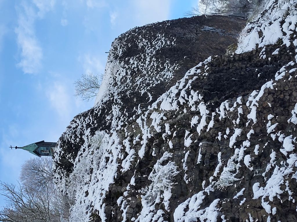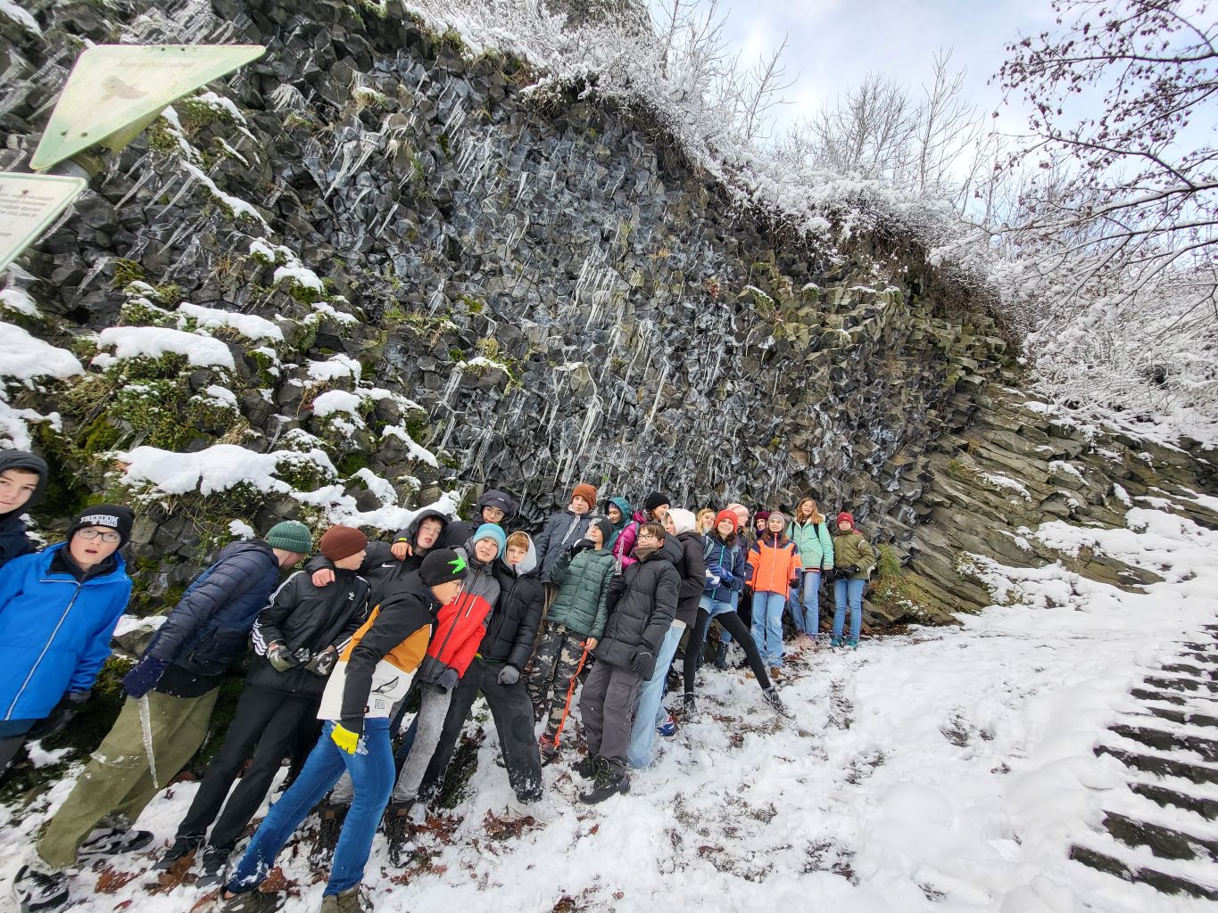 Wie auf den Bildern zu erkennen, interessierten sich die Schülerinnen und Schüler vor allem für die Eiszapfen an den Basaltsäulen und den Schnee auf dem Hügel des Parksteins (Kapelle).