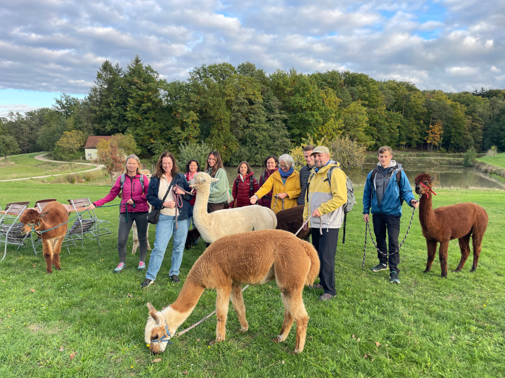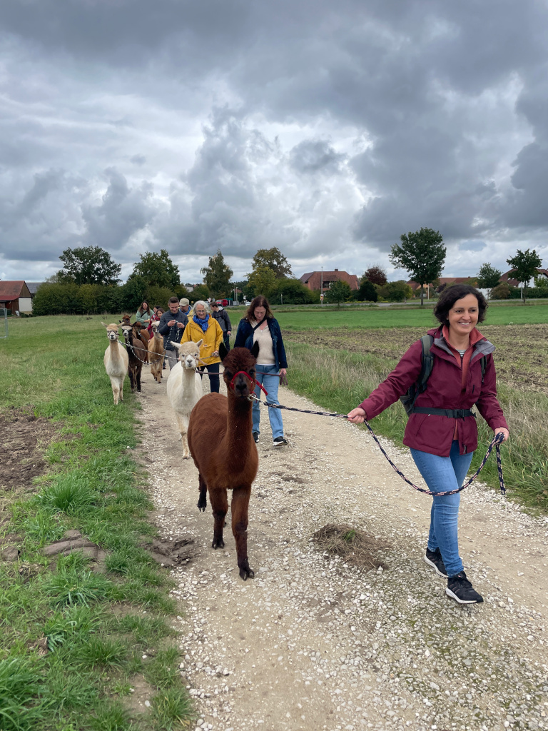 Die Kolleginnen und Kollegen der fortbildungsfreudigen Fachschaften Biologie und Chemie haben sich an einem herbstlichen Donnerstagnachmittag zu einer Alpakawanderung aufgemacht. Unter dem Titel „Alpakawanderung: Verhaltensbeobachtung beim Tier und gleichzeitig Stressreduktion durch Entschleunigung im Berufsalltag“ liefen die Teilnehmenden unter der Führung von Anke Siegismund von den Bimbachtal Alpakas auf Forst- und Feldwegen Richtung Obermembach. Acht völlig wesensunterschiedliche Tiere wurden von den Lehrerinnen und Lehrern geführt, zunächst noch etwas unsicher, dann aber immer souveräner. Frau Siegismund erklärte einiges zu den einzelnen Tieren, ihren Wesenseigenschaften, ihrer Herkunft und der Rasse, aber auch zu besonderen Verhaltensweisen und dem Einsatz zwei ihrer Tiere im Seniorenheim. Erwiesenermaßen reduziert der Kontakt zu Tieren das Stressempfinden durch die verminderte Ausschüttung des Stresshormons Cortisol und zeitgleich die erhöhte Ausschüttung des „Wohlfühlhormons“ Oxytocin. Diesen Effekt konnten (noch) nicht alle Teilnehmenden gleichermaßen spüren. Freunde an dem Ausflug hatten jedoch alle.