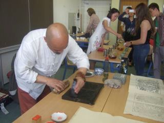 Zur selben Zeit ließ der Kunstdruckmeister die Schüler ihre eigenen Kunstwerke erstellen: Tinte auf die Holzunterlage auftragen, das Papier gerade darauflegen und mithilfe eines schwammartigen Instruments zusammenpressen. Die Hauptarbeit an dieser Technik, das Schnitzen feiner Konturen in das Holz nur mit einem Messer, ersparte der Meister unseren Schülern.