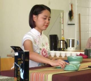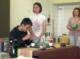 Die Teeschalen wurden mehrmals mit heißen Wasser ausgespült, um Bakterien abzutöten und die Schalen gleichzeitig vorzuwärmen. Dass der Ablauf solch einer Teezeremonie komplizierter ist, als er zunächst scheint, konnte auch ein Schüler mitbekommen, der versuchte, anhand der Anweisungen der Teemeisterin selbst Tee zu servieren.