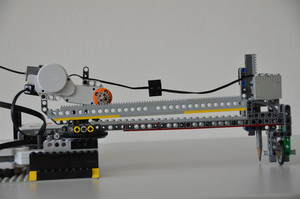 Unser Roboter ist im Allgemeinen ein ganz normaler Plotter, der allerdings nicht mit x-, und y-Koordinaten rechnet, sondern einen Arm im Halbkreis bewegt auf dem ein im Radius variierbarer Stift befestigt ist. Er ist über ein USB-Kabel mit einen PC verbunden, auf dem ein weiteres Programm läuft. Dieses stellt eine weiße Fläche dar, auf die mit einem Gamepad gezeichnet werden kann. Der gezeichnete Pfad wird simultan in Polarkoordinaten umgerechnet und dem Roboter übermittelt. Video ansehen ... popup: yes
