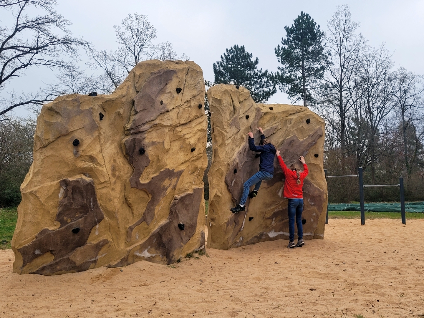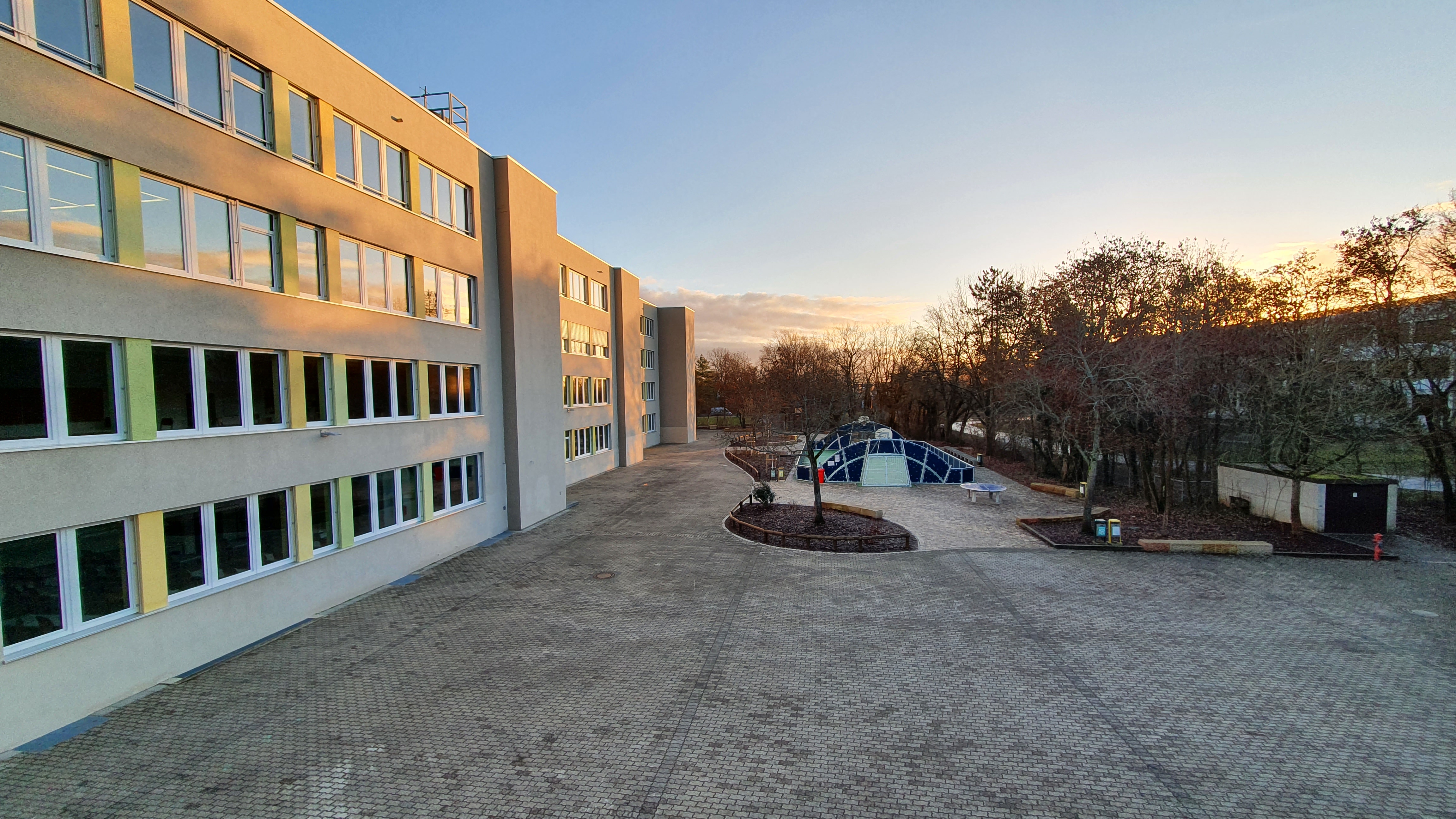 Frisch gestaltet und gut ausgestattet ist auch unser Pausenhof, der auf zwei Seiten vom Schulgebäude und auf den anderen von Mensa, Steinforstgraben und den "Orgelpfeifen" eingeschlossen wird und damit einen perfekten Schutzraum zur Pausenerholung bietet.