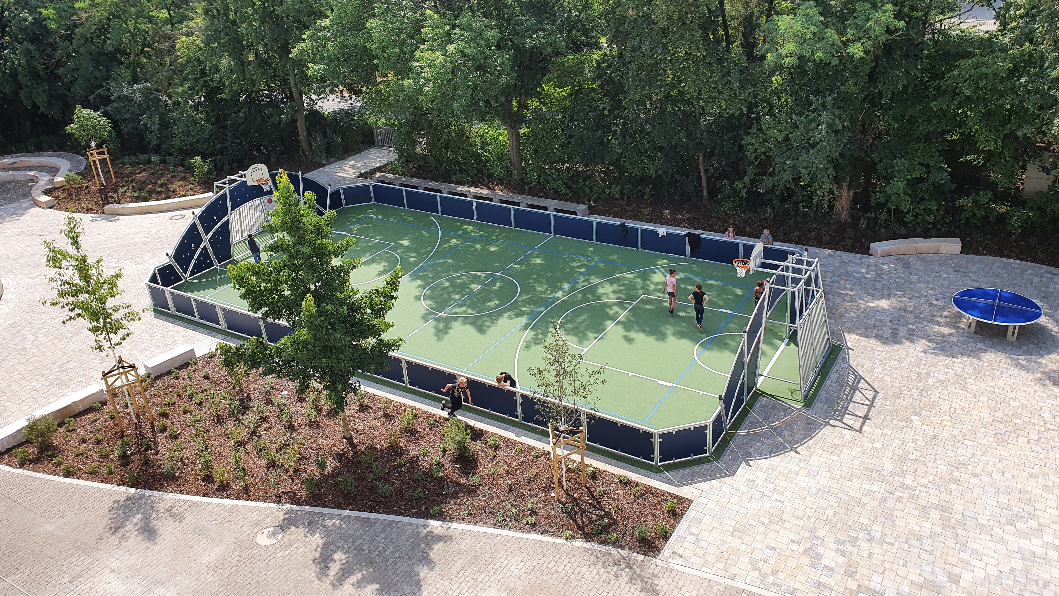 Doch neben der Erholung schaffen Basketballkörbe, ein halbrundes Freilufttheater und insbesondere der Multicourt viele Anlässe, den Hof auch für Sport, Spiel und Unterricht zu nutzen.