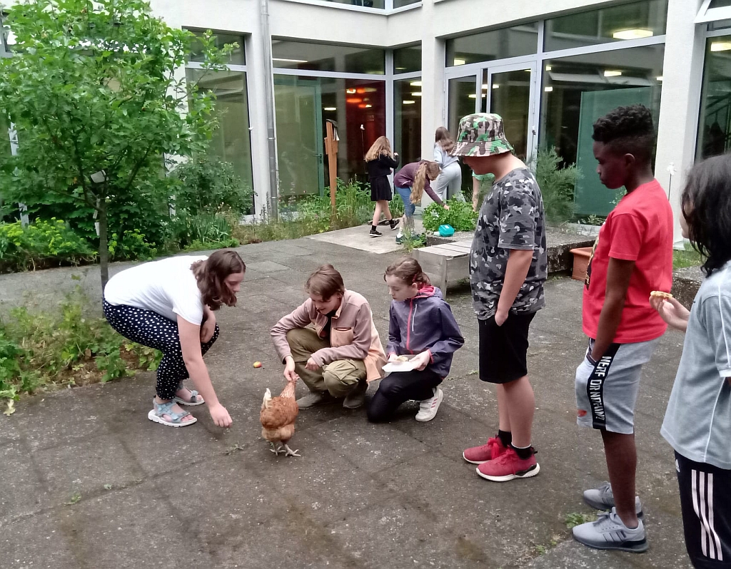 Ruhiger geht es normalerweise im Atrium zu: Von allen vier Seiten vom Schulgebäude umgeben, ist es als Garten und Biotop gestaltet. Hier wachsen im Sommer Obst, Kräuter und Gemüse, aber die Pflanzen werden auch von Vögeln und Insekten dankbar angenommen.
