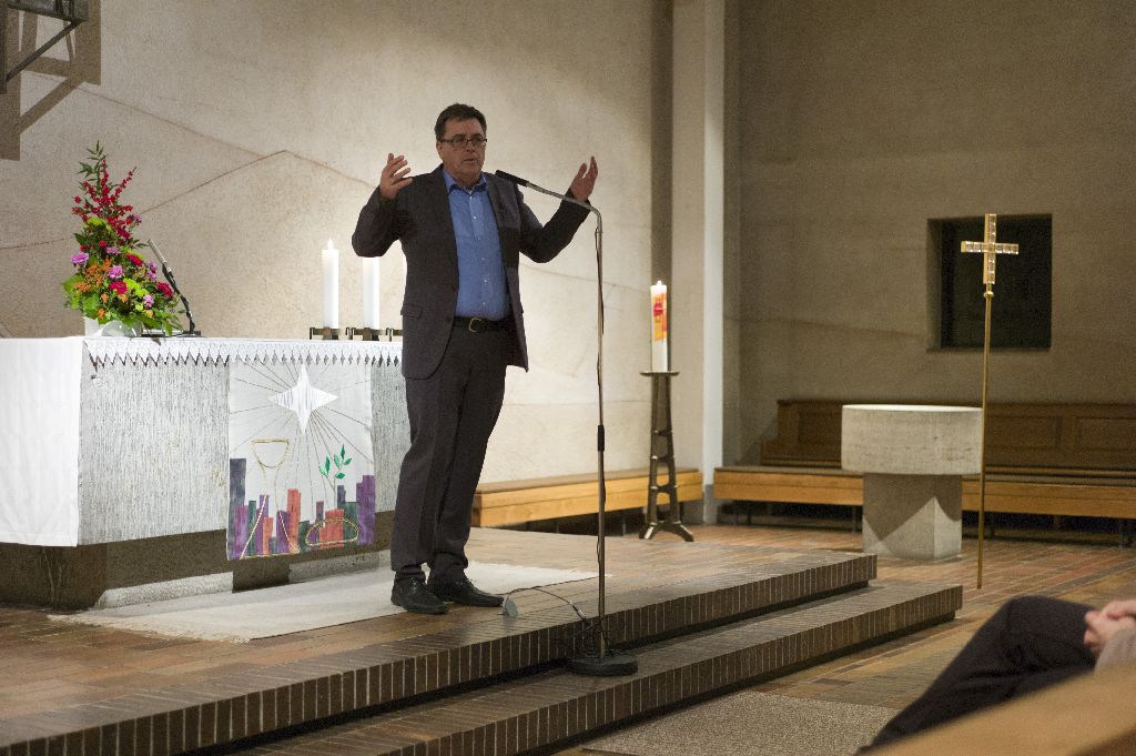 Als Moderator fungierte tiefgründig Dr. Jürgen Belz, Religionspädagoge am Albert-Schweitzer-Gymnasium und Schulbeauftragter für Gymnasien, Realschulen und berufliche Schulen des Dekanats Erlangen (Bild oben bei "Der Morgen").