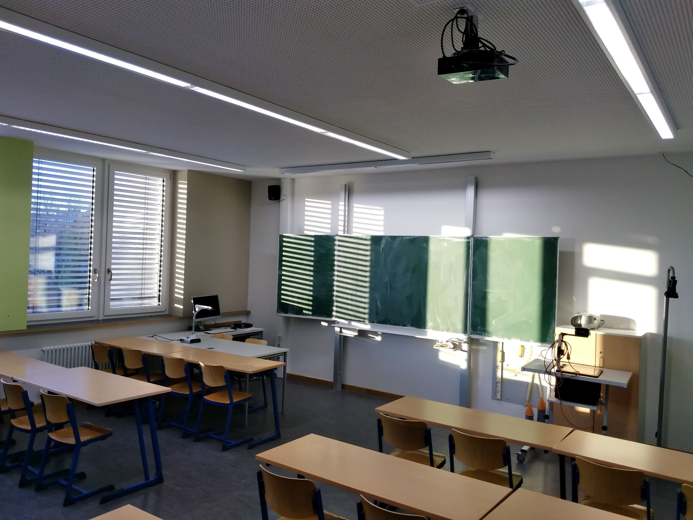 Die Klassenzimmer verfügen über eine zeitgemäße Ausstattung: Alle Räume verfügen über einen PC mit Internet-Anschluss, eine äußerst beliebte Dokumentenkamera und einen Beamer. Im Neubau sowie in den Fachräumen gibt es White- und Smartboards.